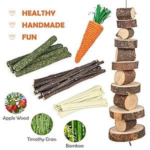 NATURAL&HEALTHY: The rabbit treat and chews are made of 100% natural material. Quality apple wood and timothy hay ball string for chewing. Natural woven balls for bunnies to chew up and play with. Grass balls and cakes which are wealthy in nuitrition, lend a hand making improvements to digestion and increasing appetite.