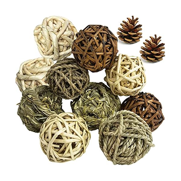 【PACKAGE AND SIZE】One package contains 12 balls: two 2.8-inch diameter seaweed balls, two 3.15-inch diameter black cane balls,two 3.15-inch diameter Timothy balls, two 2.8-inch diameter corn leaf balls ,two pinecones 2.3 inches high and two 3.15-inch peeled wicker balls.Help to keep your pets teeth from becoming overgrown and causing health problems. Perfect alternative of plastic toys.