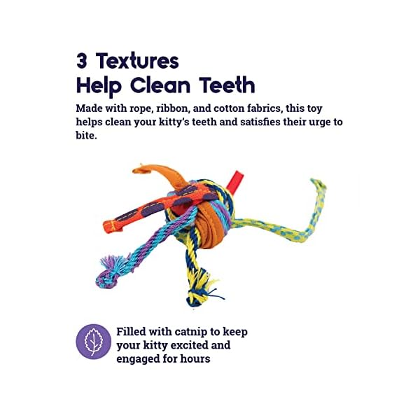 THREE TEXTURES HELP CLEAN TEETH: Made with rope, ribbon, and cotton fabrics to help clean your kitty’s teeth and satisfy their urge to bite as they chew on this colorful cat toy!