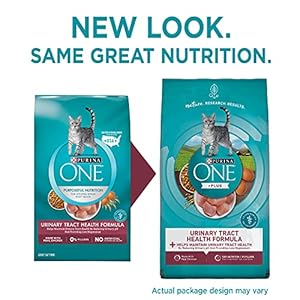 Make your cat’s urinary tract health a priority with Purina ONE +Plus Urinary Tract Health Formula adult dry cat food. This high protein cat food kibble reduces urinary pH and provides low magnesium, and the real chicken Purina cat food recipe gives her a taste she loves. The premium adult cat food contains 0 percent fillers, and each bite of this cat dry food is crafted with an easily digestible SmartBlend. This urinary tract health dry cat food provides 100 percent complete and balanced nutrition for adult cats, including added vitamins, minerals and nutrients to promote good health. Purina ONE +Plus Urinary Tract Health Formula adult cat food features a crunchy kibble with added calcium that helps support her strong teeth and healthy gums, while four antioxidant sources support a strong immune system. The high protein formula supports strong muscles, and omega-6 fatty acids help promote healthy skin and a soft, luxurious coat to keep her looking her best.