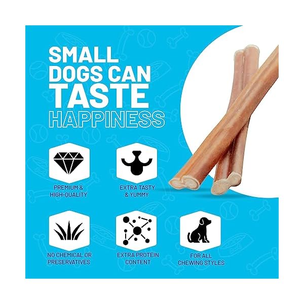 DENTAL HEALTH 🦷: Our all-natural bully sticks act as natural toothbrush for your doggy, reducing plaque, and keeping teeth and gums clean and fresh. These good chews also help strengthen the jaw muscles, reduce stress, and act as a dopamine generator for your dog’s brain. Thin and little, they are perfect for all dogs, specially for small and medium breeds!