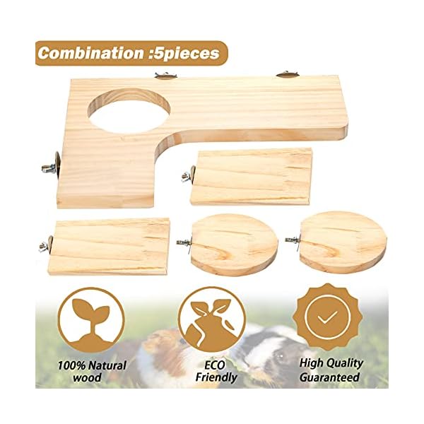 Package: A set of hamster wooden platforms include a L-shaped wooden board, 2 round wooden boards and 2 square wooden board. Different shapes and sizes could meet the hamster’s More than one playing preferences.